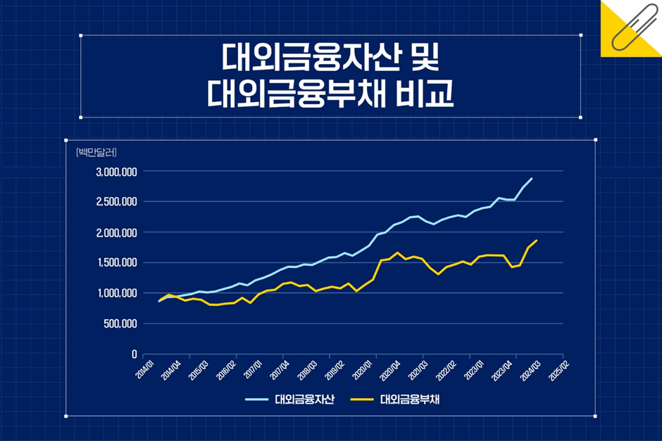 2014년 1분기말 대외금융자산 규모는 9,835억달러인데 대외금융부채는 1조 30억달러이므로 거의 비슷하였다. 그러나 2025년 3분기말 대외금융자산은 2조 7,976억달러이고 대외금융부채는 1조 7,414억달러로 나타나 그 격차(순대외금융자산)는 1조 562억달러로 나타나 그만큼 외화가 유출되면서 외환시장에서 외화 수요가 컸을 것이다.