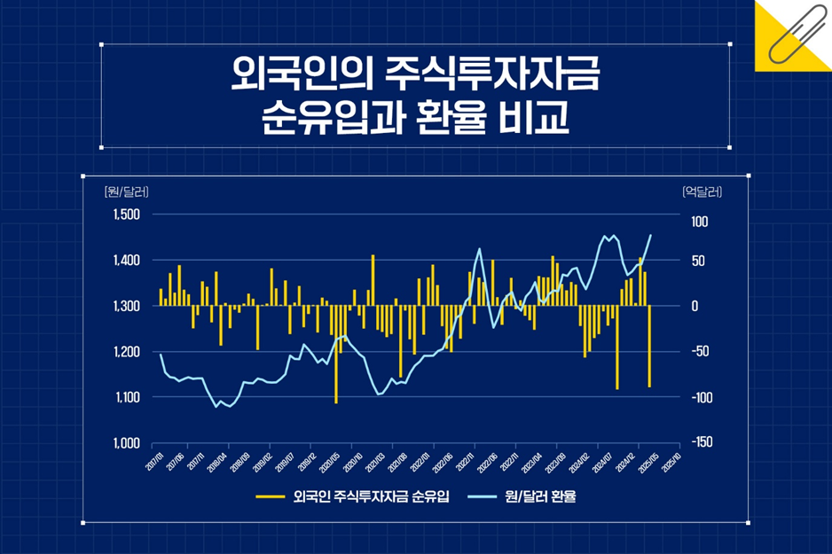 외국인 투자가가 한국에 주식을 투자하기 위한 외화의 유출입을 보면 순유입되는 시기에는 환율 수준이 낮아지고 순유출*이 많은 시기에는 환율이 상승하는 경향이 높다. 외국인의 주식 투자자금 통계**를 2017년부터 이용하여 분석해 보면 2024년 이후 이러한 모습이 특히 잘 드러나고 있다. 실제로 2025년 1∼11월 중 외국인의 주식투자자금 순유입액은 –82.5억달러로 나타났다. 결과적으로 순유출이 많았고 그만큼 환율 상승에 기여했다고 볼 수 있다.