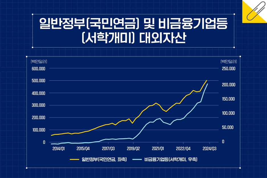 2025년 3분기말 현재 국제투자대조표에 나타난 국민연금을 포함하고 있는 일반정부의 대외투자자산 규모는 5,125억달러이고 서학개미를 포함하고 있는 비금융기업등의 대외투자자산 규모는 2,003억달러이다.* 2024년 4분기말 잔액이 각각 4,259억달러, 1,400억달러인데 금년 중 3분기까지의 증가규모를 보면 각각 866억달러, 603억달러로 일반정부가 더 많이 투자한 것으로 나타났으나 증가율을 구해보면 일반정부는 20.3%이고 비금융기업등은 43.0%로 각각 나타나 비금융기업등의 대외자산 규모가 훨씬 빨리 증가한 것으로 나타났다.