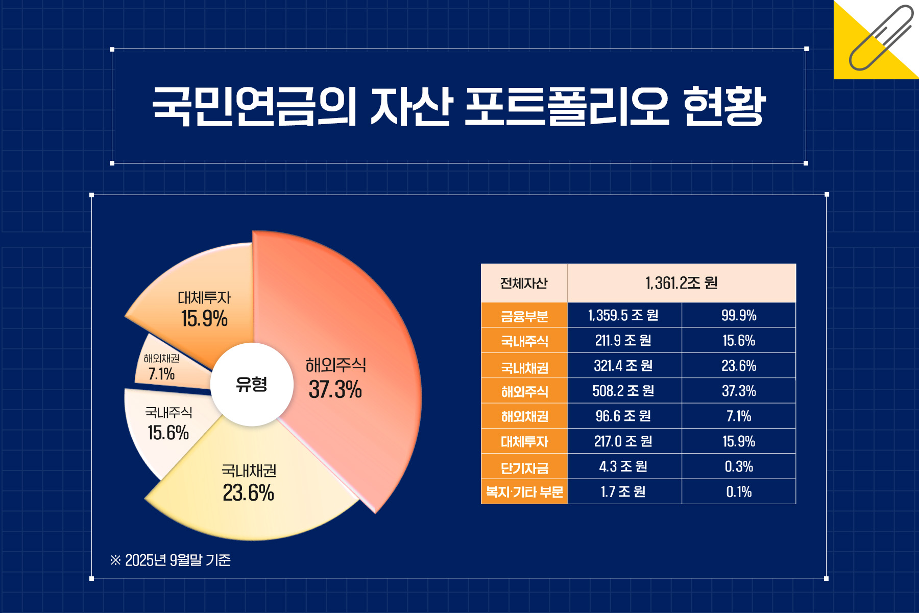 국민연금의 자산 포트폴리오 구성내역을 보면 2025년 9월 말 현재 해외주식 규모를 보면 전체자산 1,361조원의 37.3%인 508조원이다. 해외채권도 97조원으로 전체자산의 7.1%를 차지하고 있어 이들 투자에 달러가 필요하였을 것이고 환율에 영향을 미쳤을 것이다.