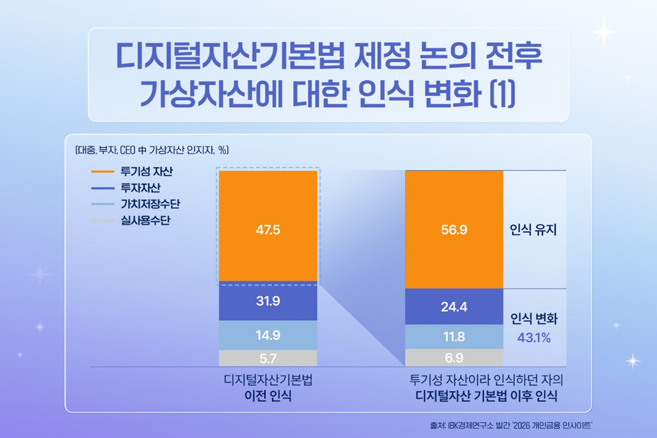 가상자산에 대한 인식은 제도적 논의와 함께 점진적으로 변화하고 있으며, 투기성 자산과 투자 자산이라는 서로 다른 시선이 공존하는 가운데 그 변화의 폭이 확대되고 있습니다.